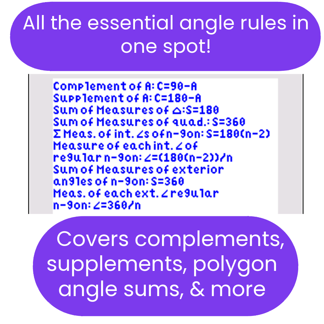 • Angle Formulas (complement, supplement, triangle/quadrilateral/polygon sums)