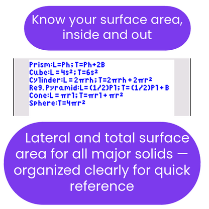 Whether you're calculating area, perimeter, volume, or working with chords, arcs, or coordinate planes — it's all right here, organized and easy to find.
