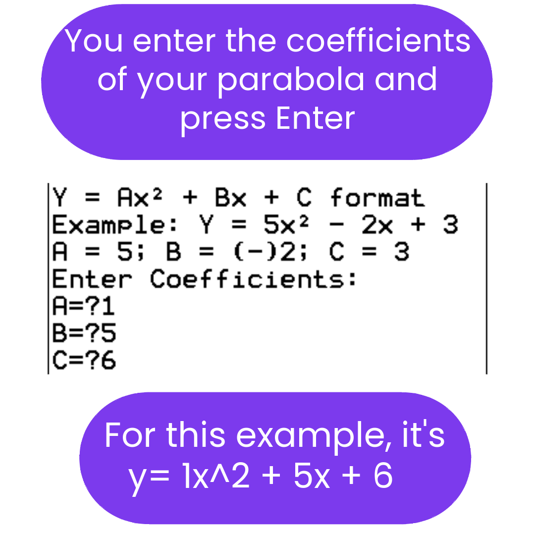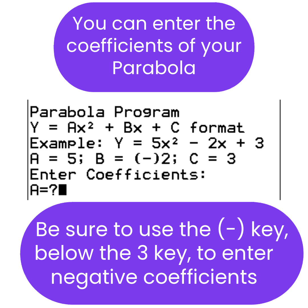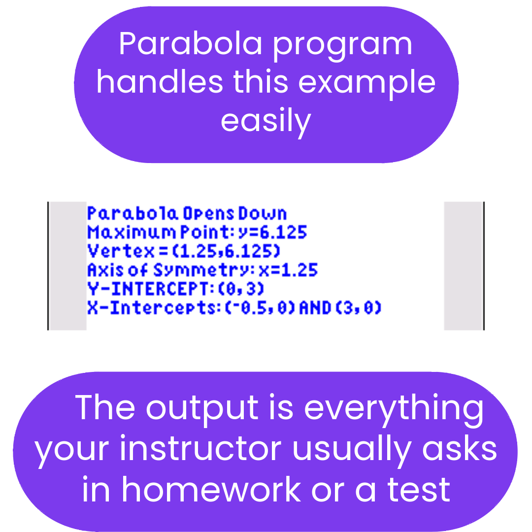 Struggling with quadratic equations in the form y = Ax² + Bx + C? This TI-84 Plus CE program takes the guesswork out of parabola problems and gives you everything you need: