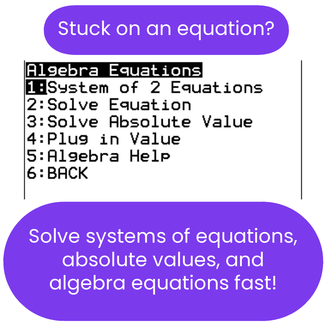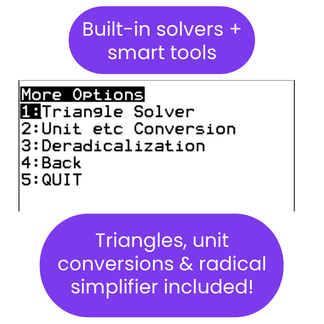 SATMATH is the most powerful and complete TI-84 Plus CE calculator program for the new Digital SAT. Its intuitive design and fast solvers help you eliminate careless mistakes and save precious time — giving you a real edge on test day. This program can confidently tackle up to 60% of SAT Math Questions.