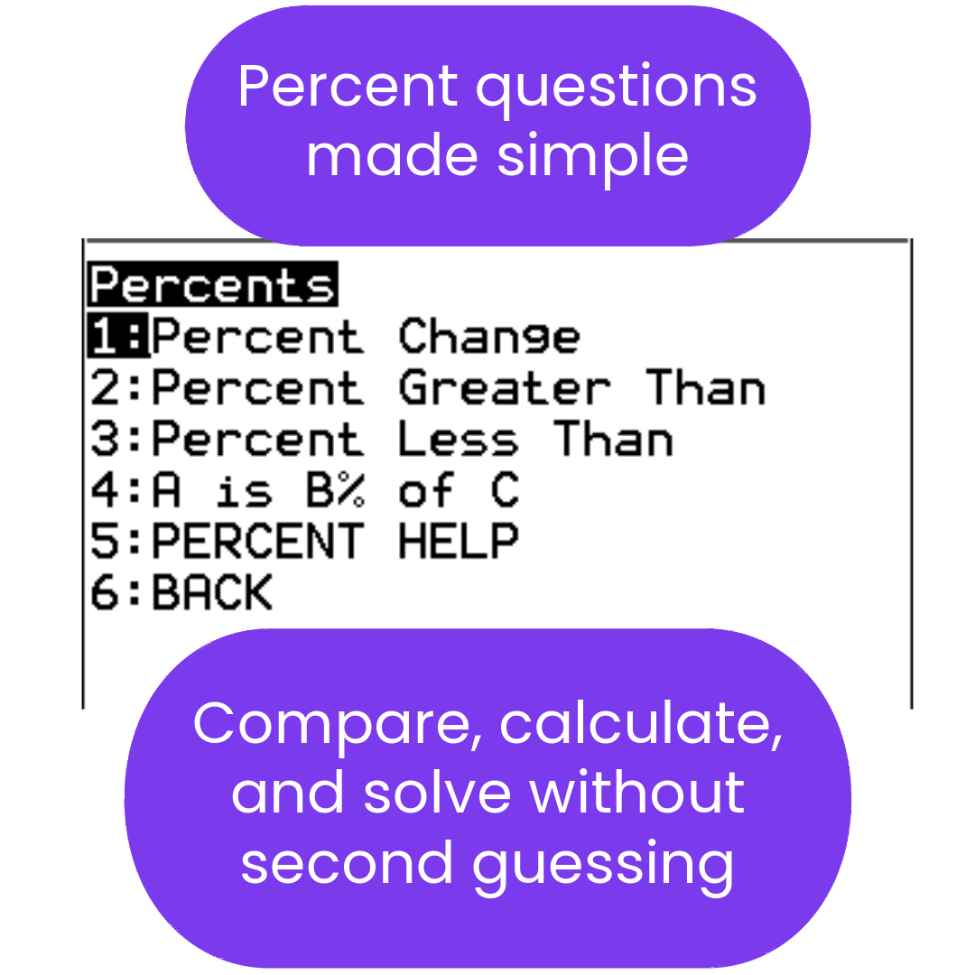 • Percentages & Stats: All percent problems, mean, median, standard deviation, and range helpers.