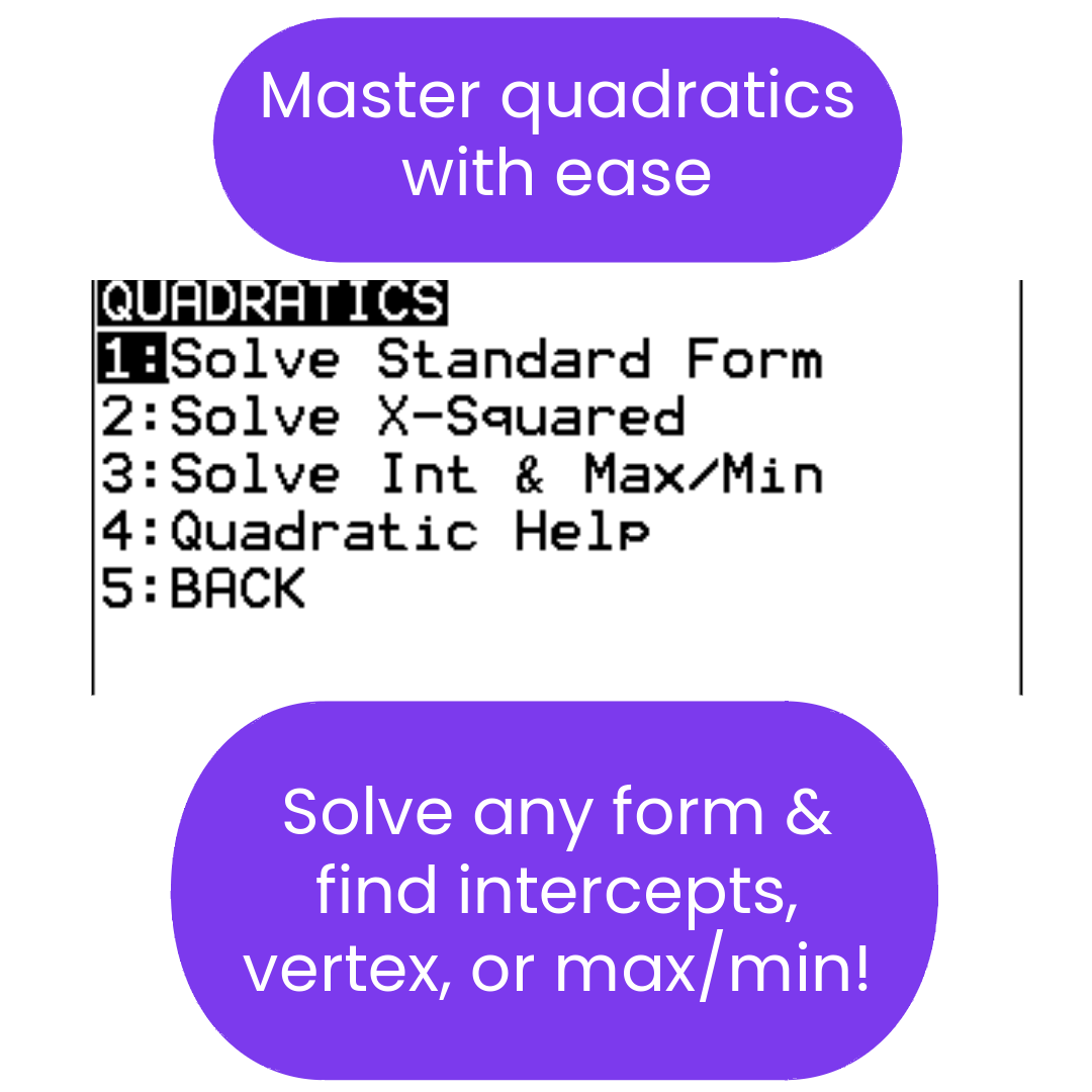 • Quadratics & Parabolas: Solve any quadratic equation (real or complex solutions) and analyze parabolas (vertex, intercepts).