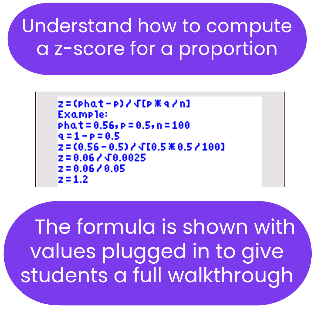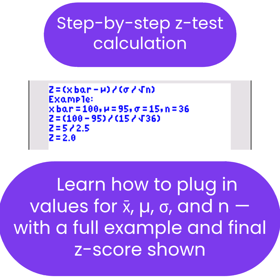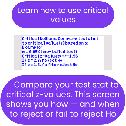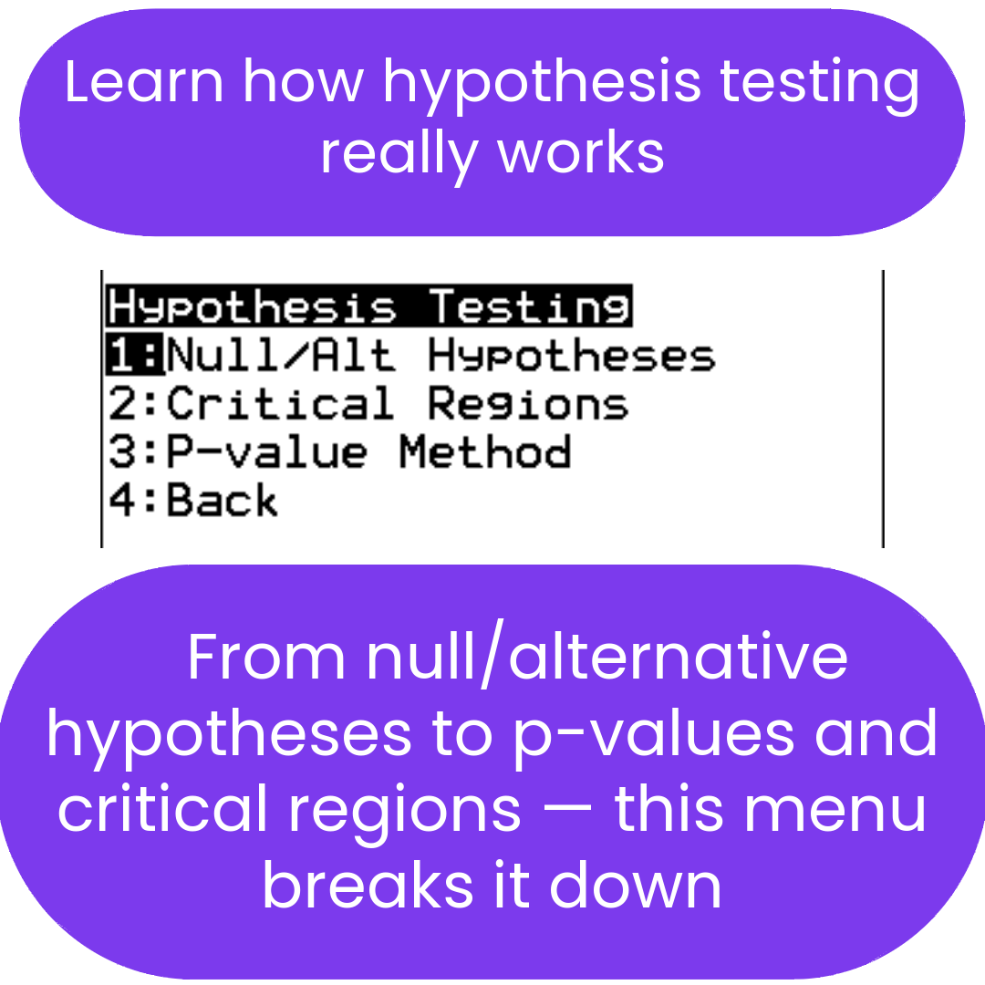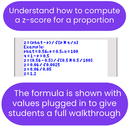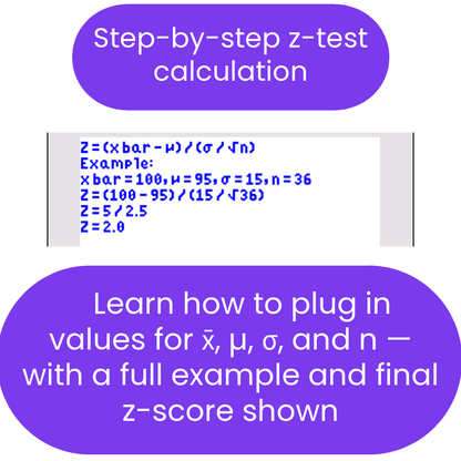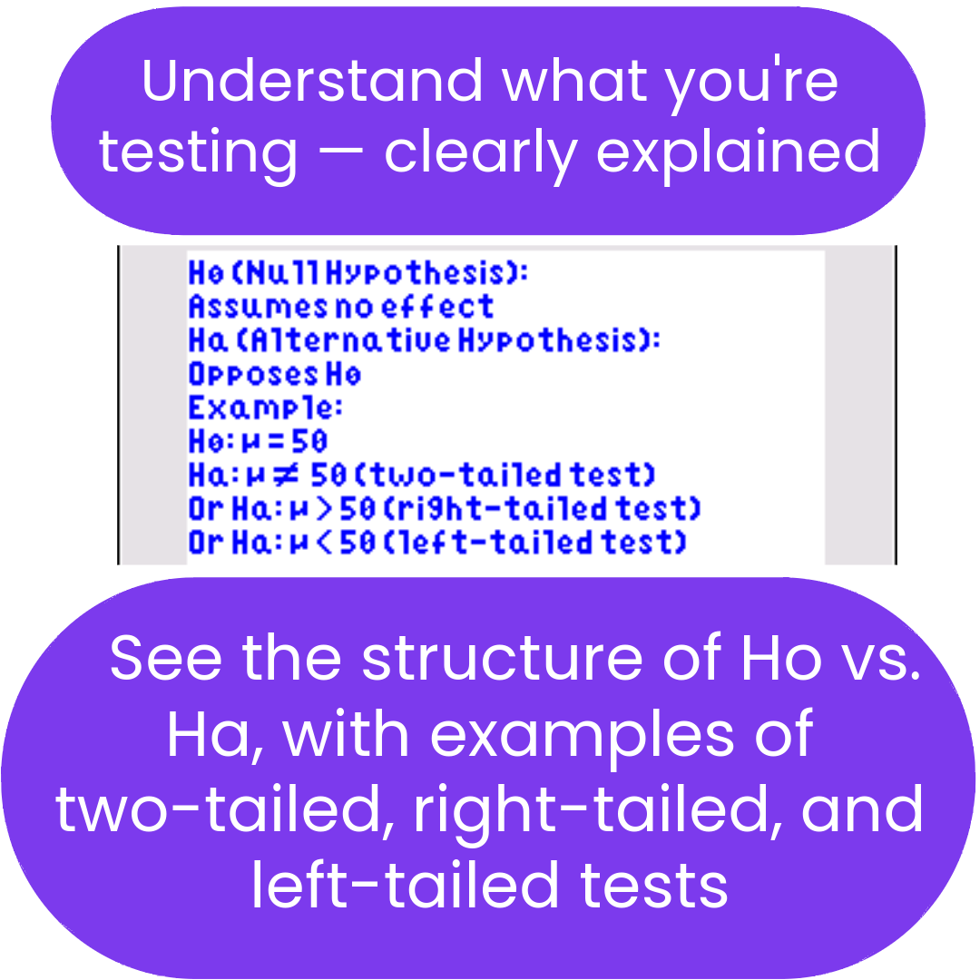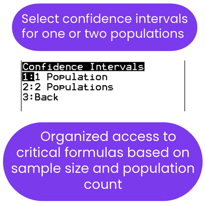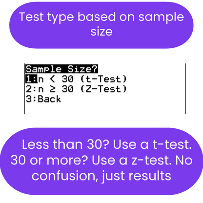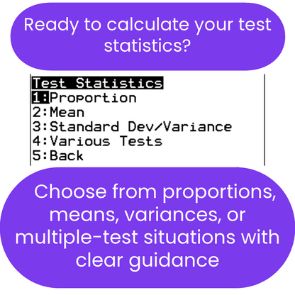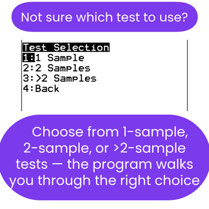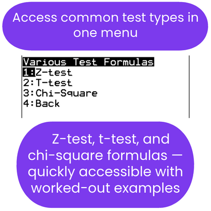 This program is perfect for AP Statistics, college-level intro stats, or any class where formulas matter. It doesn’t just show you the equations — it also gives examples, step-by-step setups, and helps you choose the right test based on your scenario.